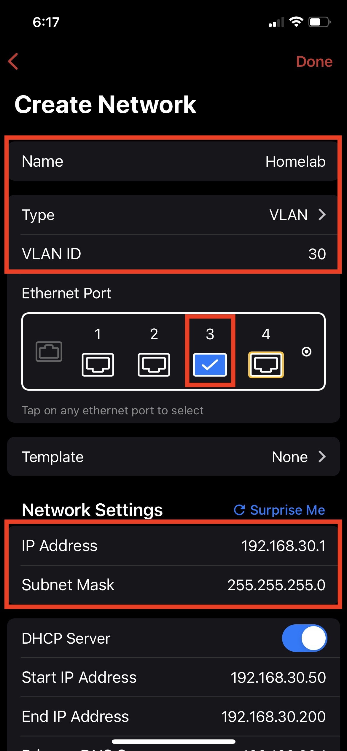 Type in the name for the VLAN, I am going with Homelab . Change Type to VLAN . Then make sure to add the VLAN ID. Based off of my network diagram above, I’ll select 30 . Now make sure to check the right ethernet port on your router so that it can actually reach your internal network. Mine uses the 3rd port on my router. After that, make sure that your IP address range and subnet mask is what you want. To make things easier for myself I tend to make the third set of two bits the same number as my VLAN ID so in my case I’ll change my IP address to 192.168.30.1 and I’ll leave the subnet mask as is.
