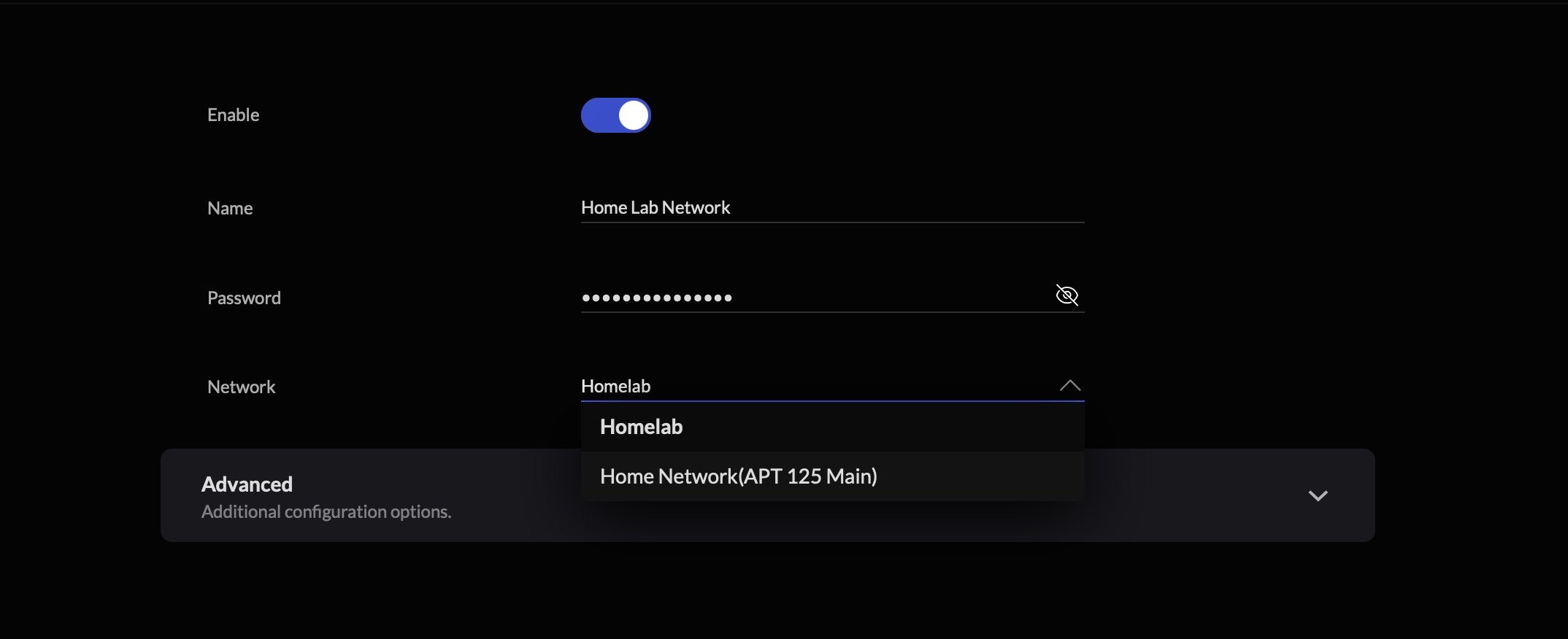 For my setup, I want to have a wireless home lab network. To set this up, I’ll select the WiFi tab in the same settings menu. Create the name of your wireless network. I’m keeping the same trend as before, Home Lab Network (boring I know). Create a unique password for your home lab network. Lastly, make sure to select the newly created Network that we created just before this. The network name I created is called Homelab . The last thing I like to do before clicking Add WiFi Network is click Advanced → Security → check Hide WiFi Name . I like to hide the SSID of my Home Lab network just so it doesn’t show up when people are actively looking for WiFi networks to join.