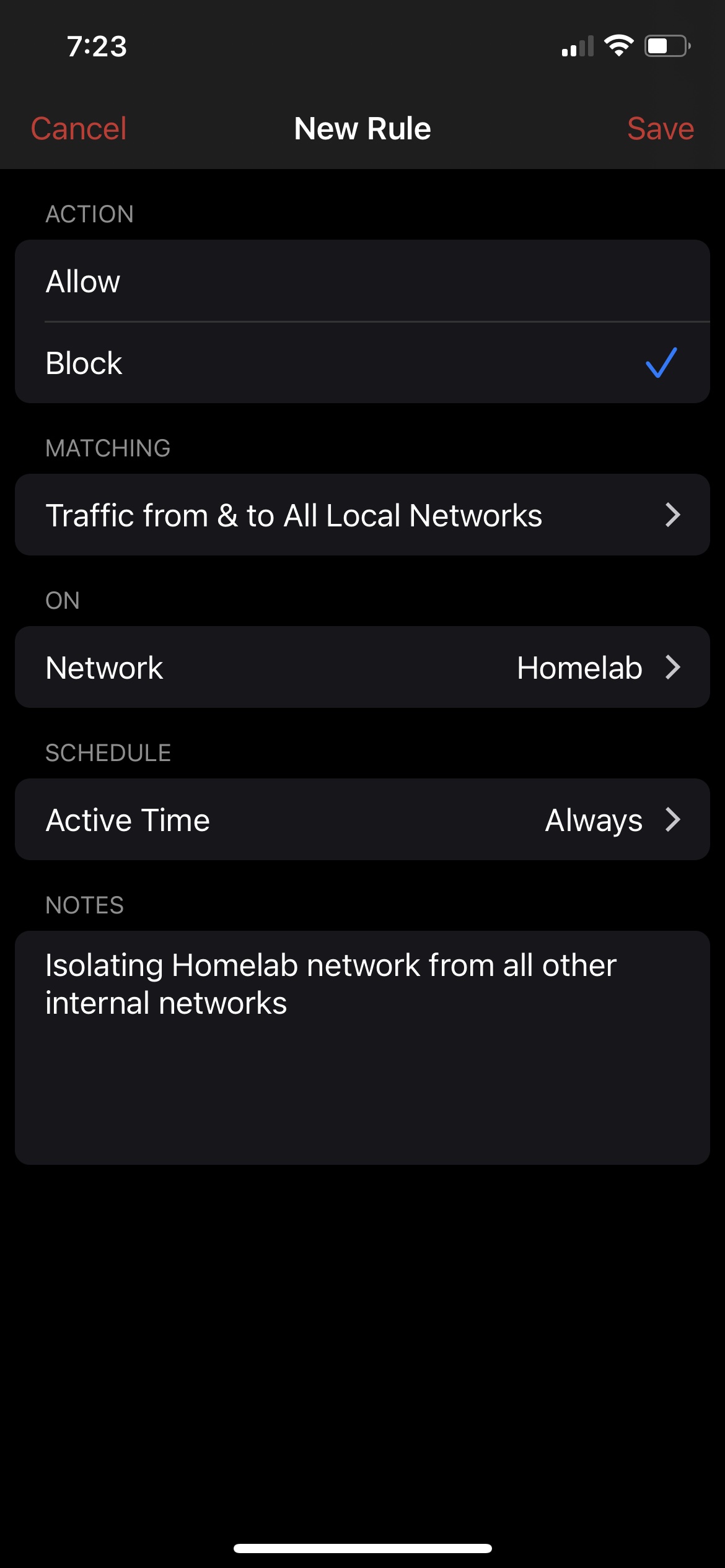 From the app select Rules → Add Rule . For the action, I’ll select Block . In the Matching section we have two fields we need to configure. First, we need to set a target: select Local Network → All Local Networks → Traffic from & to All Local Networks . Now we need to select which device this rule will apply to. Click the Select field and select your Homelab network. The schedule I will keep always and I’ll add a quick note to the rule Isolating Homelab network from all other internal networks . Hit Save and you should now see another rule in the list specifically for your home lab.