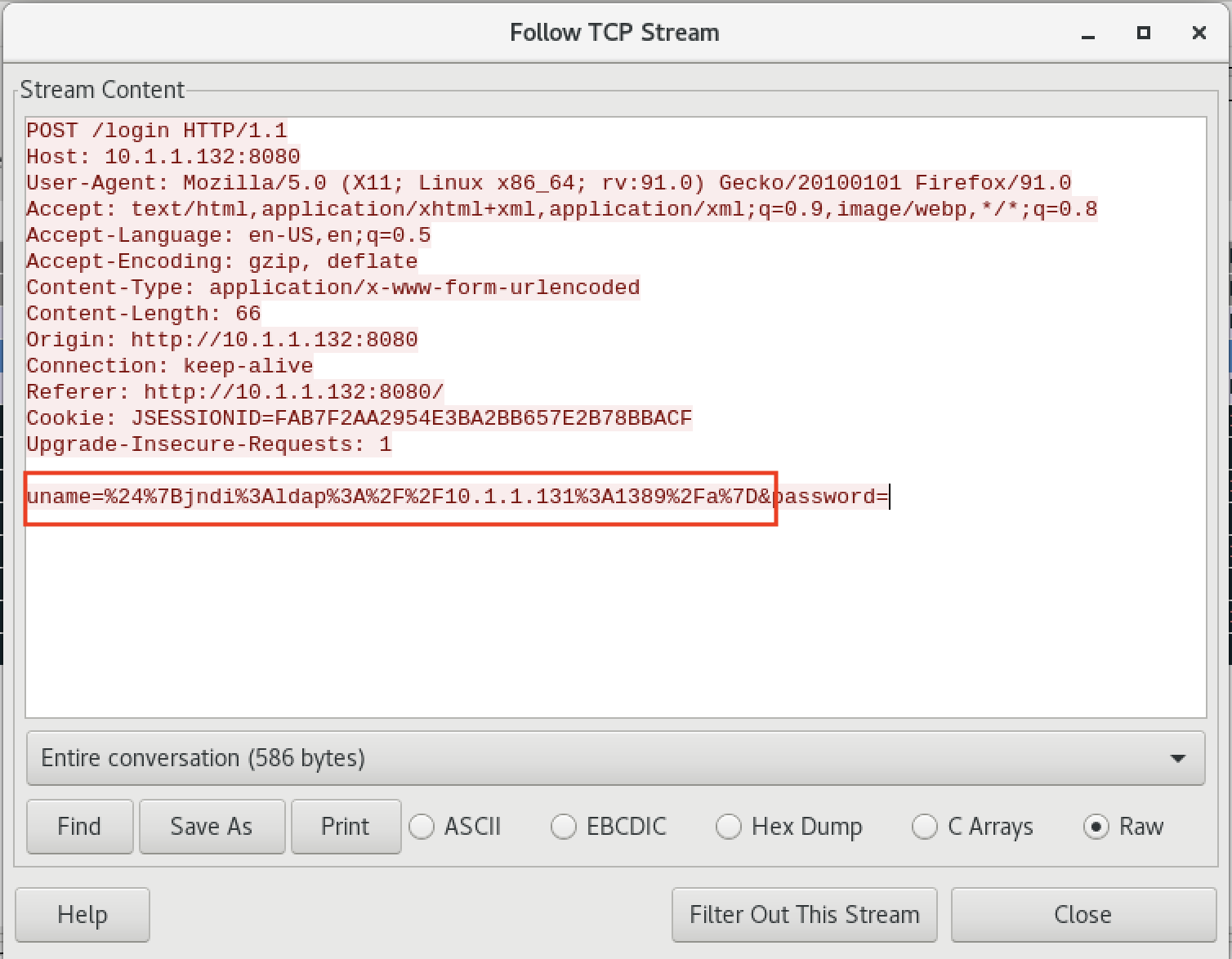 In the same vein, when we take a look at the raw PCAP data in our Wireshark session we can follow the TCP stream and see the malicious Log4Shell attempt in the uname field highlighted below:
